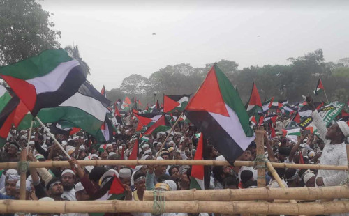 মোঃমনির,হৃদয় ইসলাম ://রোদে পুড়ে, ঘামে ভিজে, গলা ফাটিয়ে শত শত মানুষ স্লোগান দিচ্ছেন ‘তুমি কে আমি কে, ফিলিস্তিন ফিলিস্তিন’। চারপাশে শোভা পাচ্ছে লাল-সবুজ আর সাদা-কালো রঙের পতাকা। অনেকের হাতে রয়েছে ‘ফিলিস্তিন মুক্ত করো’, ‘গাজা রক্তে রঞ্জিত, বিশ্ব কেন নীরব’- স্লোগান লেখা প্ল্যাকার্ড। চারদিকে শুধু মিছিলের গর্জন। এ যেন রাজধানীর বুকে নেমে এসেছে একখণ্ড ফিলিস্তিন।